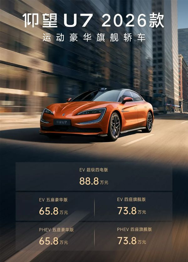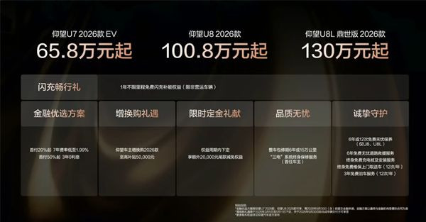 其中,仰望U72026款EV65.8万元起;仰望U82026款100.8万元起;仰望U8L鼎世版2026款130万元起。