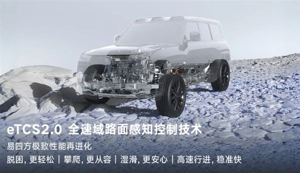 越野底盘支持全地形、全速域、全场景,毫秒级算法可实现车辆从0到200km/h速度下的路面感知,越野场景下不打滑,不侧翻。