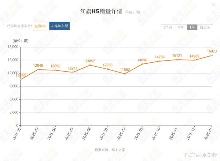 再看红旗H5。作为自主品牌冲击高端的代表,红旗H5凭借全系均衡的配置和巨大的终端优惠,成功成为了许多年轻人“第一台豪华车”的平替。2025年全年销量超过16万辆,到了2026年1月,红旗H5更是以16073辆的成绩冲进B级车销量前四,成为榜单中唯一跻身前列的国产车型。这背后,是越来越多消费者对国产品牌认可度的提升,也是红旗用产品力换来的市场回报。