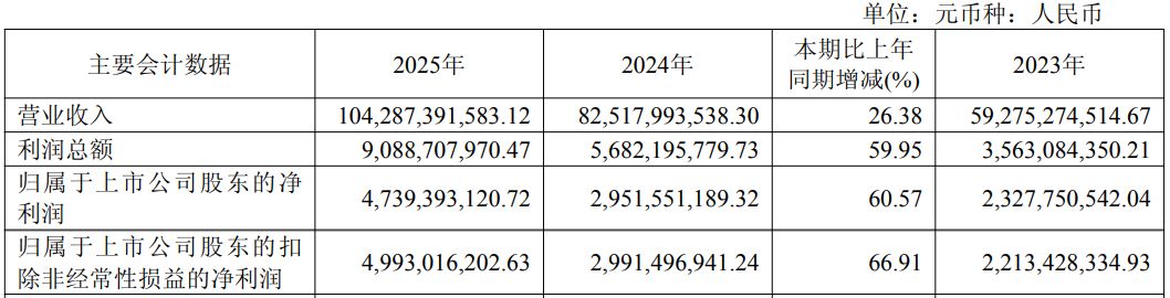 山东黄金(SH600547,股价38.03元,市值1753亿元)3月26日晚间披露2025年年报。公司2025年实现营收1042.87亿元,同比增长26.38%;实现归母净利润47.39亿元,同比增长60.57%;实现扣非净利润49.93亿元,同比增长66.91%;基本每股收益0.94元/股。公司拟每10股派发现金红利1.8元(含税)。