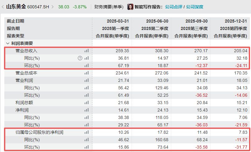 纵向来看,1042.87亿元的营收和47.39亿元的归母净利润均创山东黄金单年新高,且营收首次在单年内上破千亿大关。不过,分季度来看,山东黄金2025年第四季度的营收和归母净利润均录得环比的下滑:营收环比下滑24.11%至205.04亿元、归母净利润环比下滑31.77%至7.83亿元。