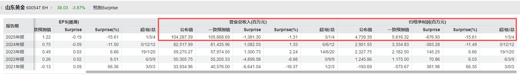 据Wind金融终端汇编的数据,4家参与预测的机构对山东黄金2025年归母净利润的一致预测值约为56.16亿元。因此,按照公司披露的47.39亿元的数据来看,公司业绩不及部分机构预期。