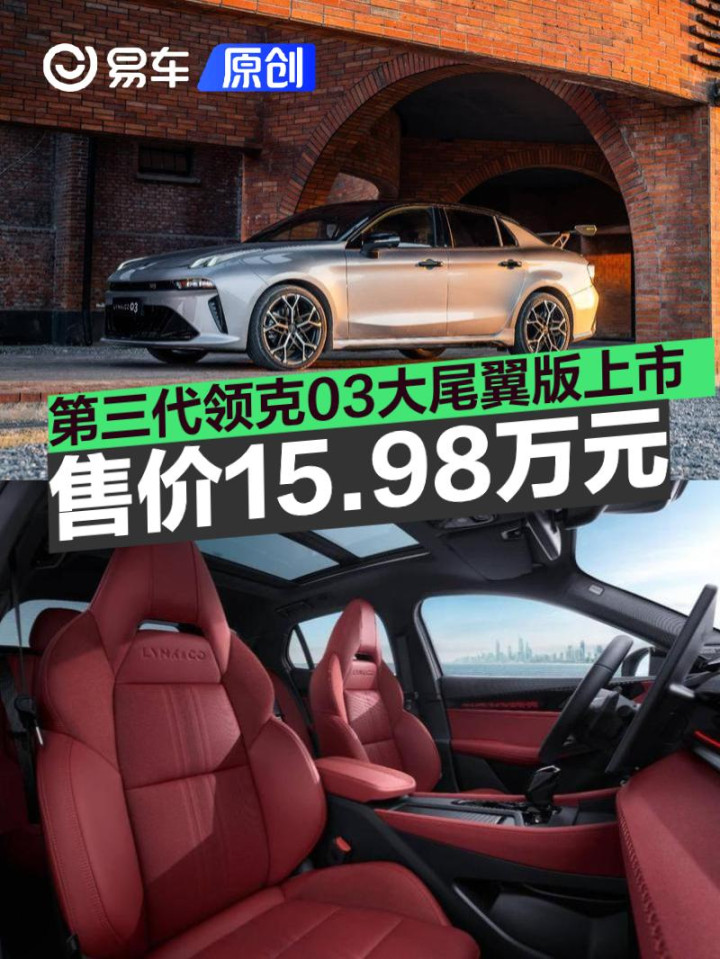 易车讯3月5日,第三代领克03大尾翼版正式上市,售价15.98万元。新版型搭载三段可调碳纤维尾翼、19英寸锋刃锻造轮毂、炽热红内饰。